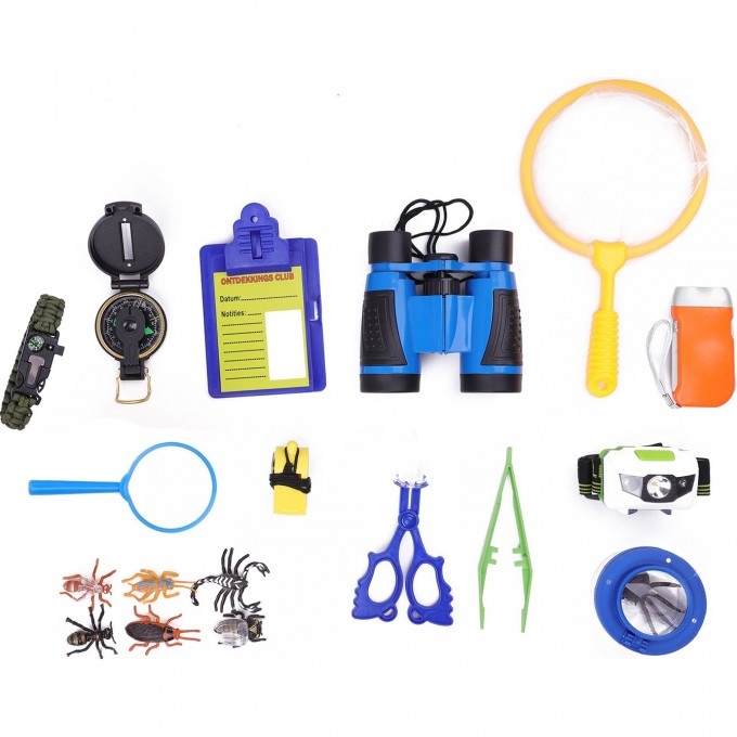 В многодневном походе пригодятся два светодиодных фонаря: налобный и динамо-фонарик, работающий без батареек. Для игр в выживальщиков отлично подойдет многофункциональный браслет-огниво. Также в наборе есть бинокль на призмах roof, компас и свисток. Что касается энтомологического снаряжения, это лупа-стакан, ручная ловушка, сачок и специальный пинцет. Есть здесь и универсальная ручная лупа. Делать маршрутные записи туриста и описывать интересные находки можно, используя блокнот-планшет.